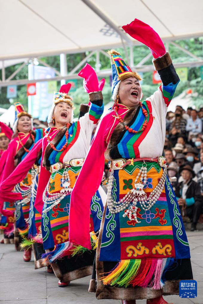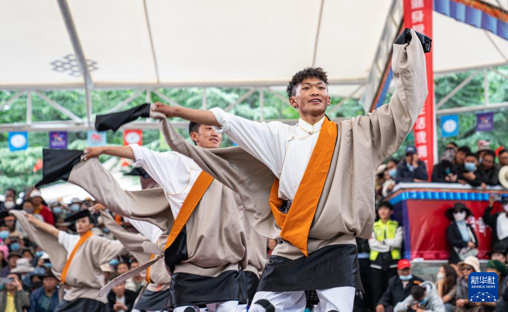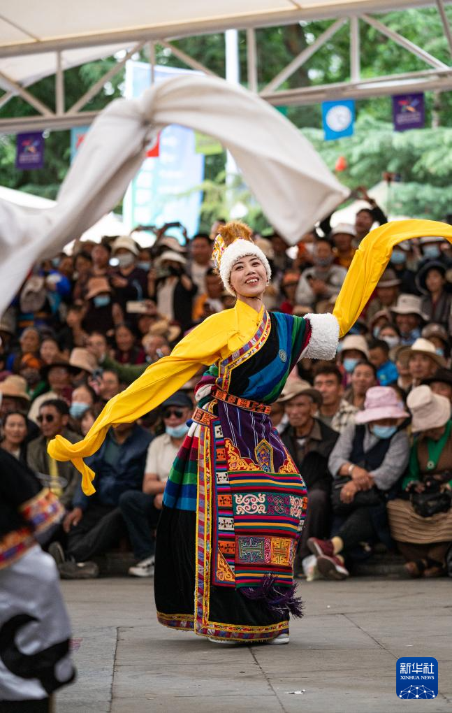 6月14日,参赛者在第二届拉萨锅庄舞大赛现场表演。