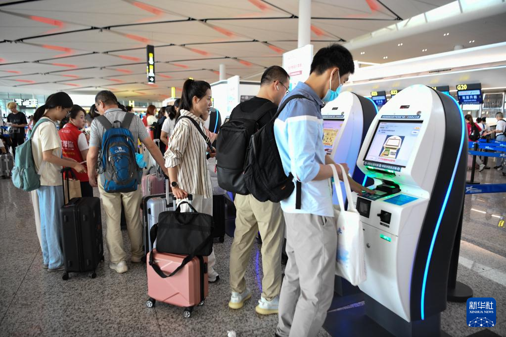 6月27日,在成都天府国际机场T2航站楼内,旅客在进行自助值机。
