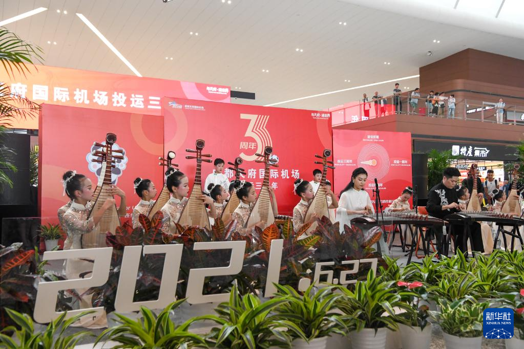 6月27日在成都天府国际机场T2航站楼内拍摄的投运三周年庆祝活动现场。