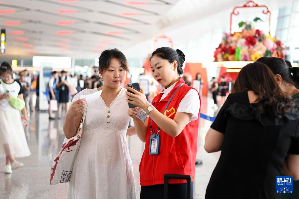 6月27日,在成都天府国际机场T2航站楼内,工作人员为旅客提供指引服务。