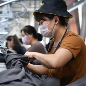7月5日,河北省肃宁县一家服装生产企业的工人在赶制服装。