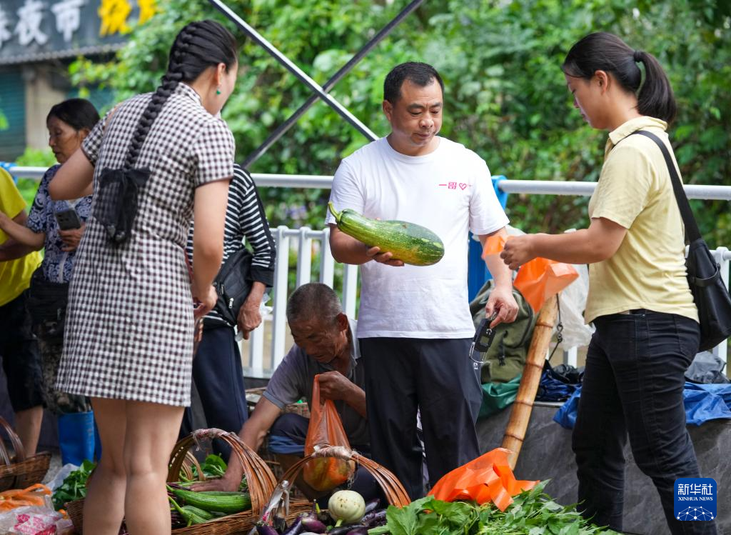 7月10日,在重庆市忠县西山渡口菜农临时直销区,秦大益(左二)帮助菜农售卖蔬菜。
