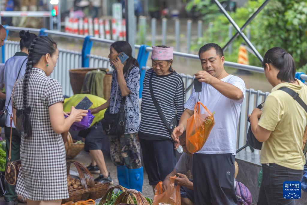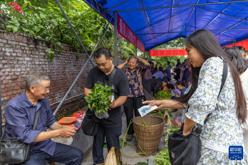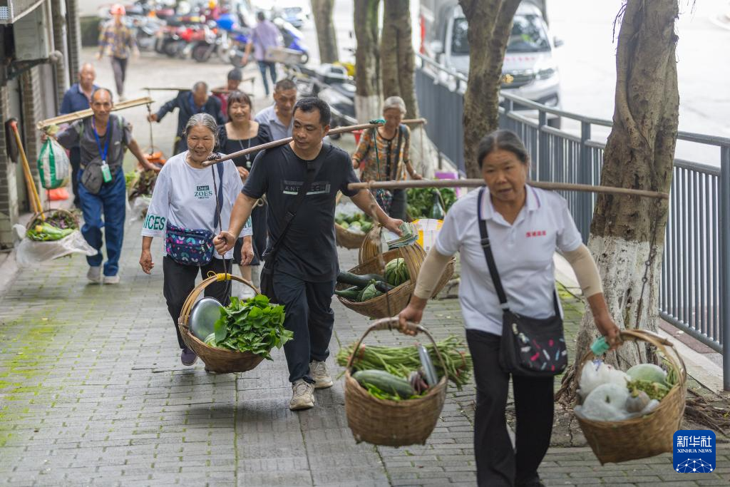 7月10日,在重庆市忠县县城,秦大益(前右二)帮助年龄较大的菜农挑菜前往售卖点。