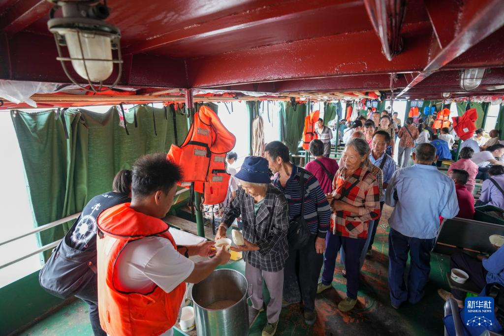 7月10日,“渝忠客2180”客轮的船舱内,船员们在为登船的菜农发放免费的爱心早餐。