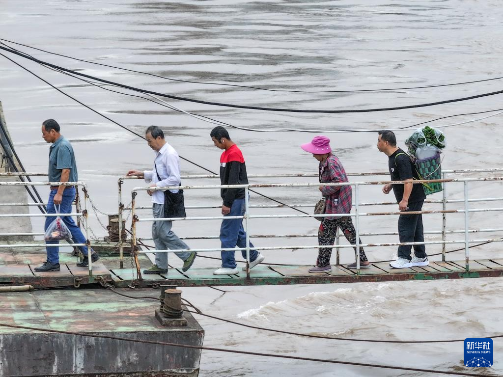 7月10日,在长江重庆忠县段,“渝忠客2180”客轮在洋渡到西山两个码头间的航线站点接乘客(无人机照片)。