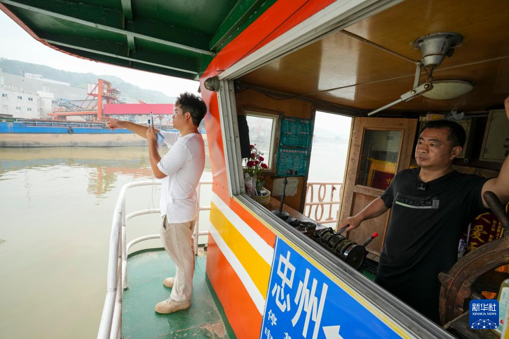 7月10日,“渝忠客2180”客轮开行中,秦大益的儿子秦源泽(左)站在驾驶室外进行直播。