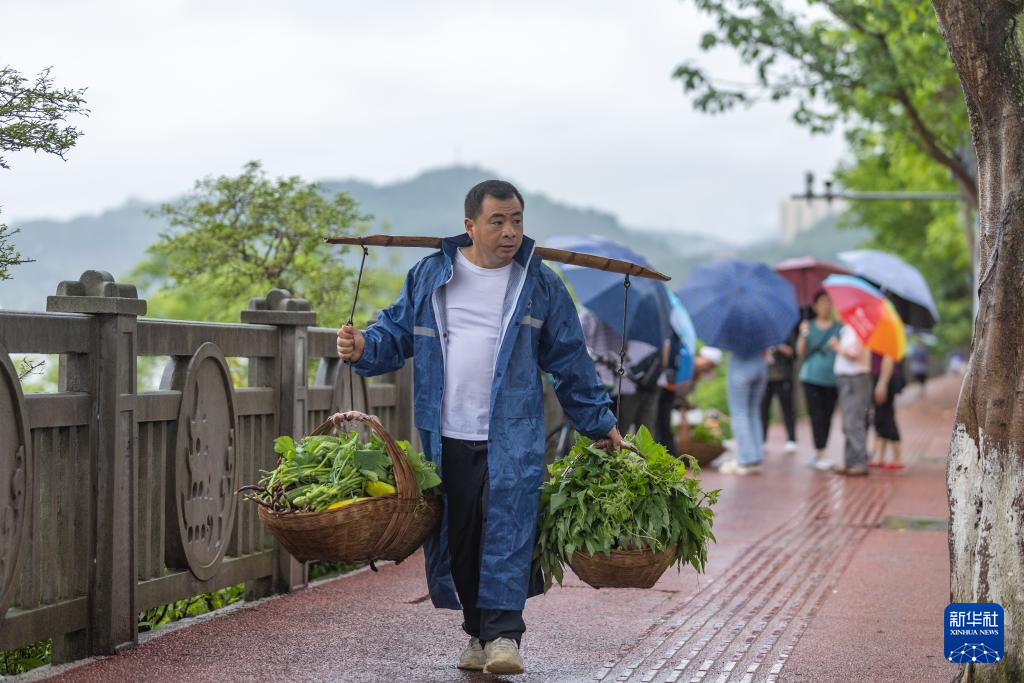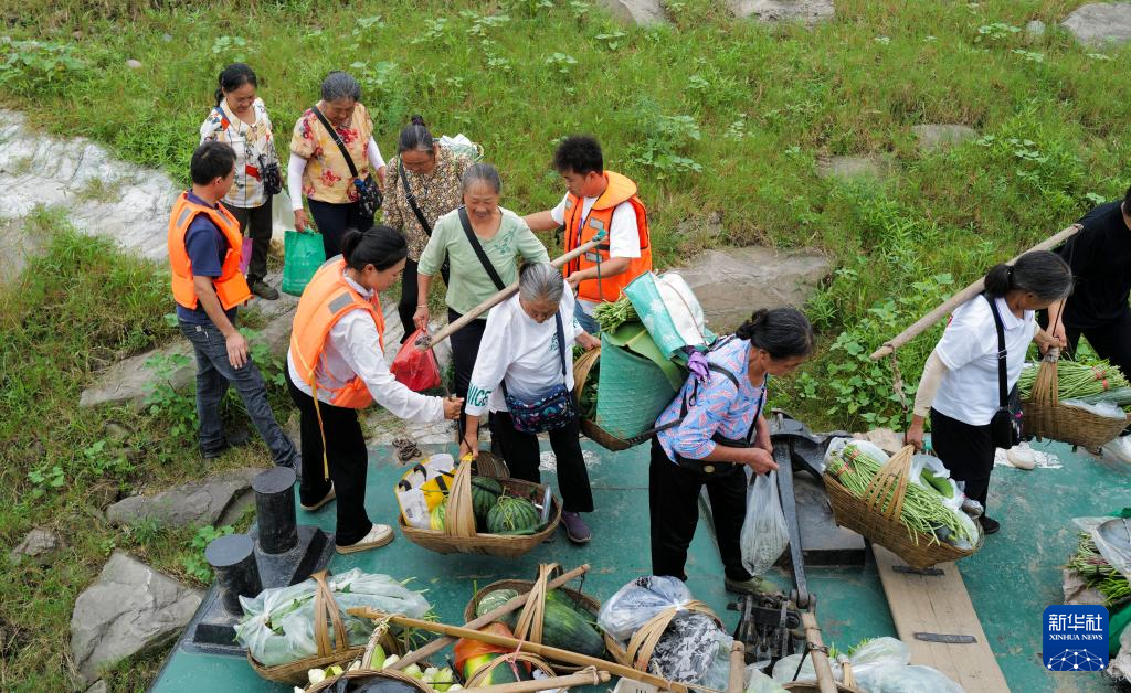 7月11日,在重庆市忠县县城西山渡口码头,秦大益帮着年纪大的菜农挑运满载蔬菜的箩筐前往西山渡口菜农临时直销区售卖。