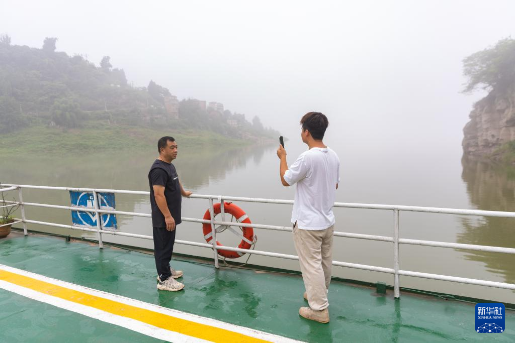 7月10日,“渝忠客2180”客轮开行中,曹利芳站在船头用手机向网民们展示薄雾中迷人的长江景色。
