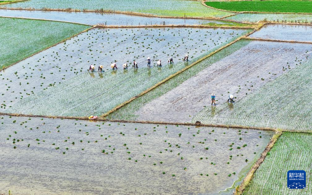 7月13日,在湖南省衡阳市衡东县大浦镇,当地村民在进行晚稻插秧工作(无人机照片)。