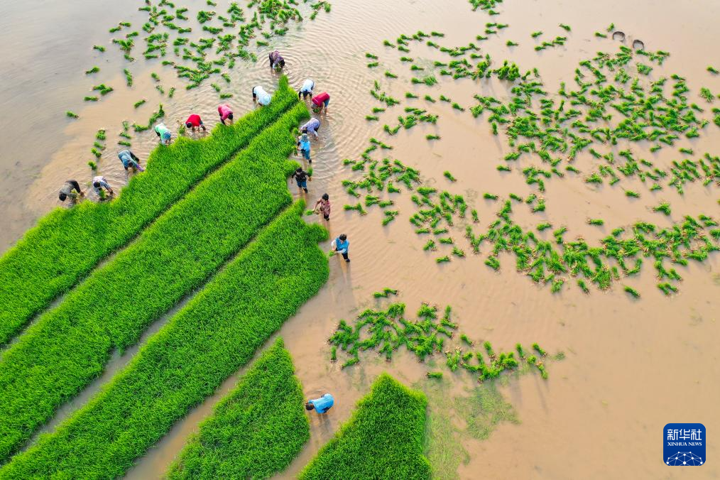 7月13日,在湖南省常宁市洋泉镇土桥村,人们在起晚稻秧苗,准备抢插(无人机照片)。