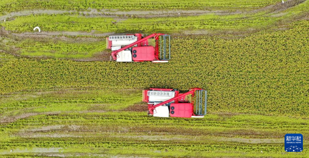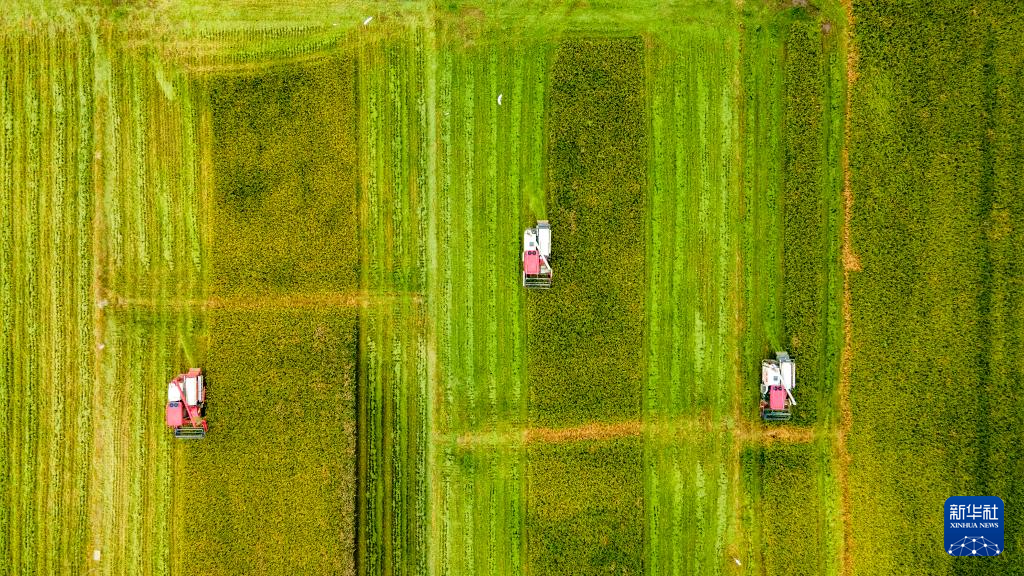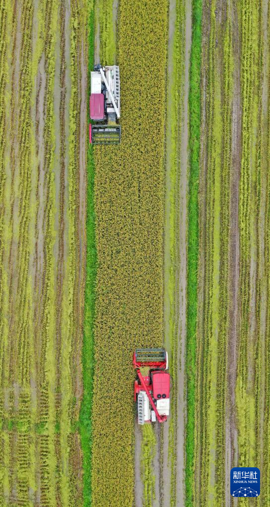 7月13日,在湖南省常宁市胜桥镇尹桥村,农民驾驶农机在收割早稻(无人机照片)。