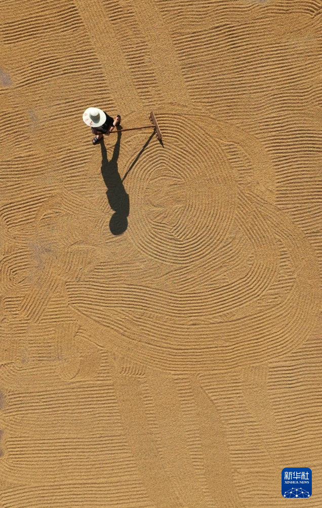 7月13日,在湖南省衡阳市祁东县金桥镇,当地村民翻晒早稻(无人机照片)。