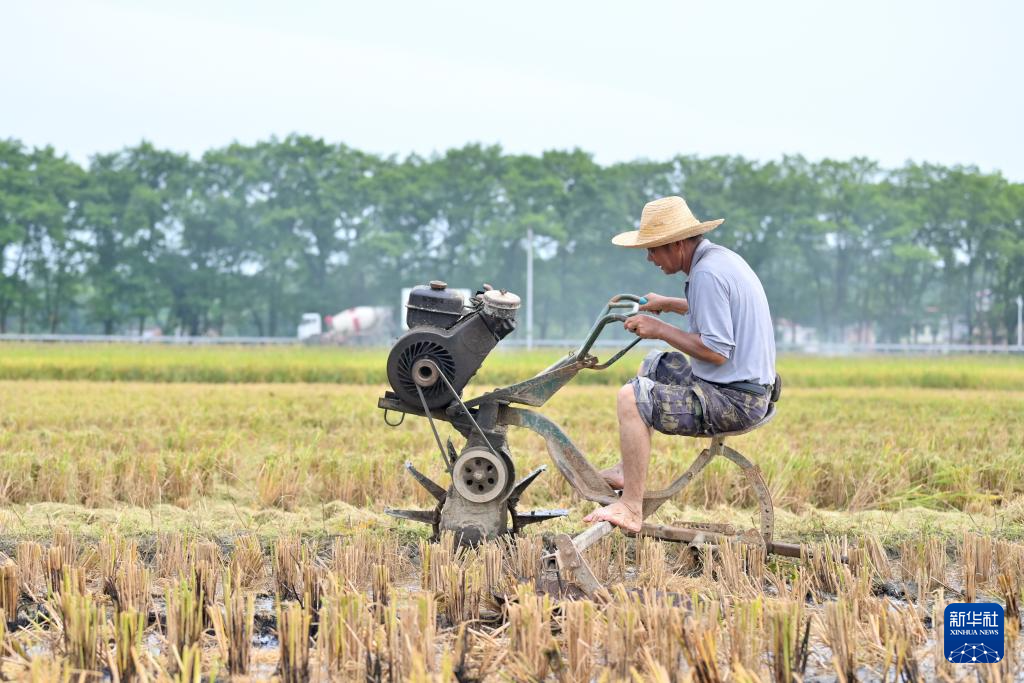 7月13日,在湖南省娄底市双峰县井字镇生机村,农民驾驶旋耕机耕整水田。