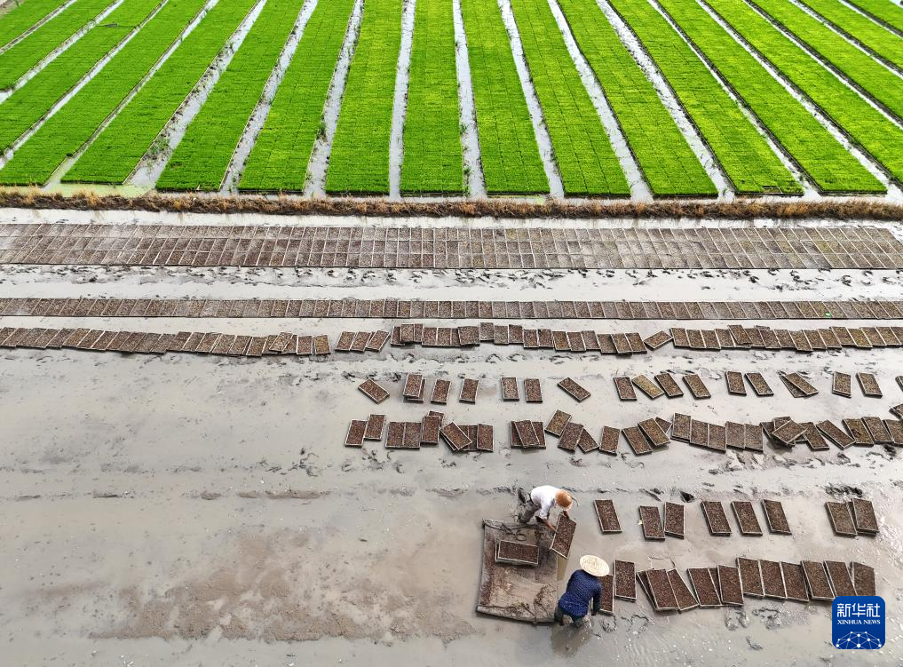 7月13日,农户在浙江省乐清市城东街道振海村集中育秧点搬运秧盘(无人机照片)。