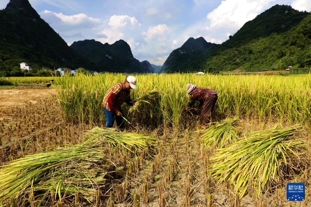 7月12日,广西壮族自治区来宾市忻城县城关镇板河村村民在田间抢收早稻。