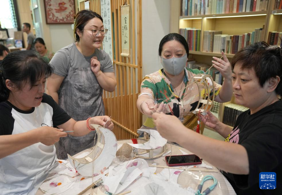 9月13日,杭州市西湖区北山街道举办的中秋庙会上,社区居民体验古法灯笼制作。