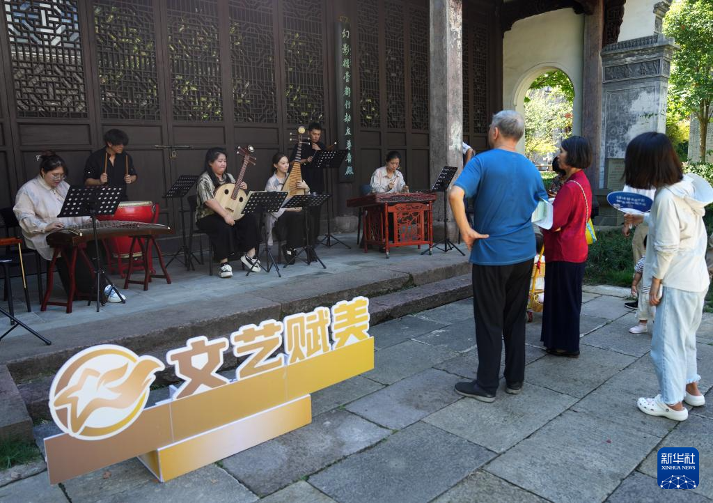 9月13日,杭州市西湖区北山街道举办的中秋庙会上,社区居民欣赏民乐展演。