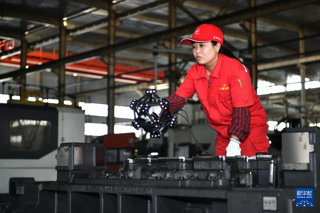 9月24日,泊头市金键模具有限责任公司技术人员在利用蓝光扫描仪检测汽车模具产品质量。