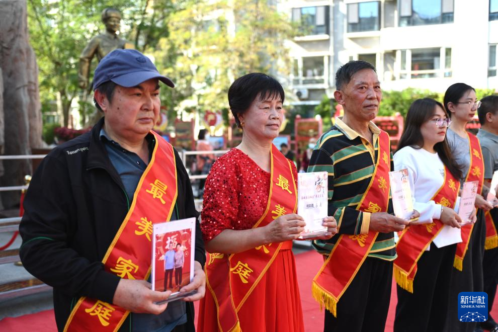 9月25日,居民在长城花园社区广场领社区“最美家庭”奖。