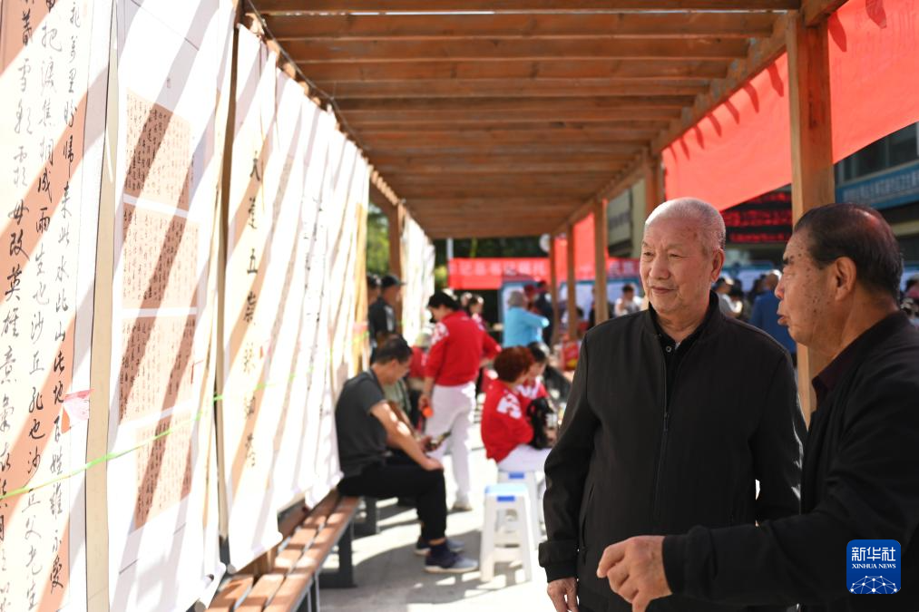 9月25日,居民在长城花园社区广场欣赏书画展览。