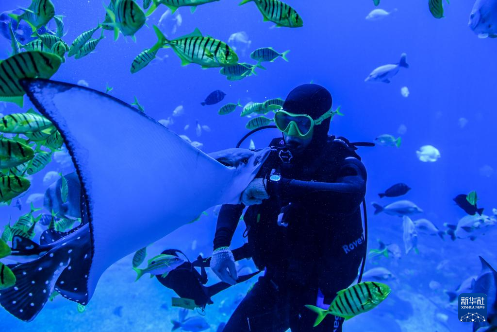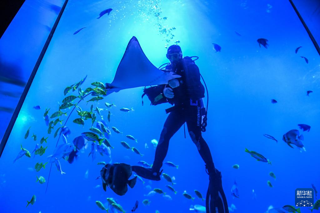 9月25日,深圳市盐田区小梅沙海洋世界,工作人员与鱼类互动。