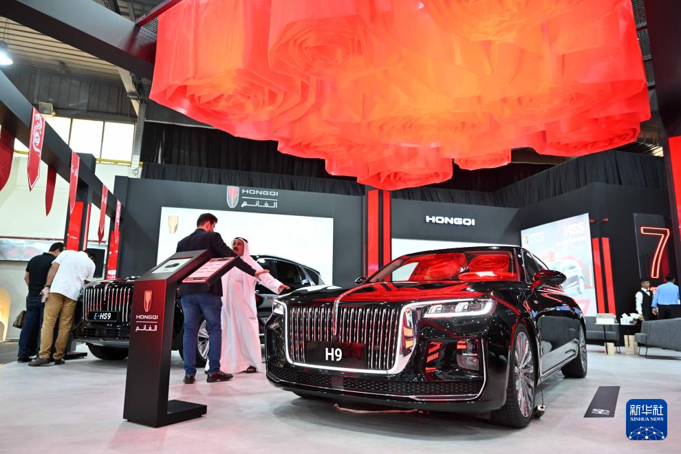 9月23日,在科威特哈瓦利省,人们在车展上参观中国红旗汽车。