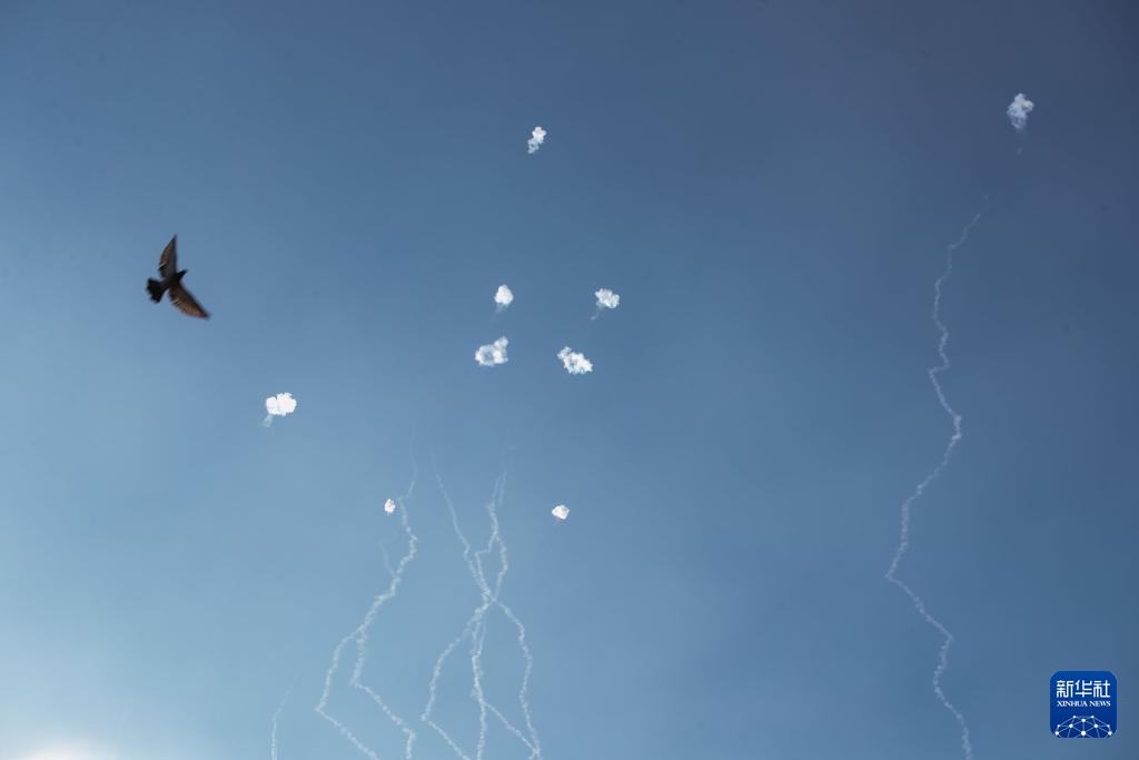 9月26日,在以色列北部塞费德,火箭弹被以色列防空系统拦截后留下烟轨。