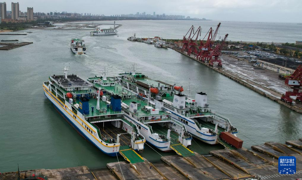 10月27日,琼州海峡恢复通航后,客滚船驶离海南省海口市秀英港(无人机照片)。