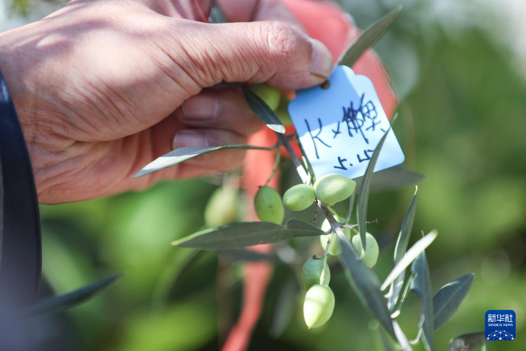 10月28日,在位于甘肃省陇南市武都区的陇南市经济林研究院油橄榄研究所大堡油橄榄试验园,陇南市经济林研究院油橄榄研究所高级工程师王贵德观察一株由奇迹油橄榄(原产地希腊)和佛奥油橄榄(原产地意大利)杂交的种子的生长情况。