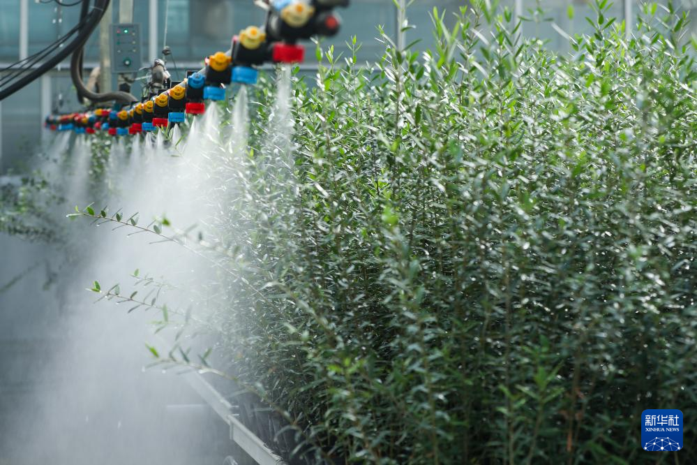 10月28日,在位于甘肃省陇南市武都区的陇南市经济林研究院的智能温室内,设备自动为油橄榄苗浇水。