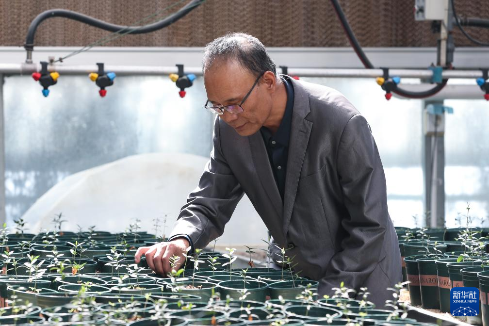 10月28日,在位于甘肃省陇南市武都区的陇南市经济林研究院油橄榄研究所大堡油橄榄试验园,陇南市经济林研究院油橄榄研究所高级工程师王贵德在智能温室内观察杂交种苗生长情况。