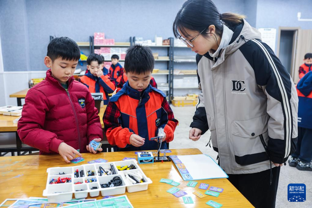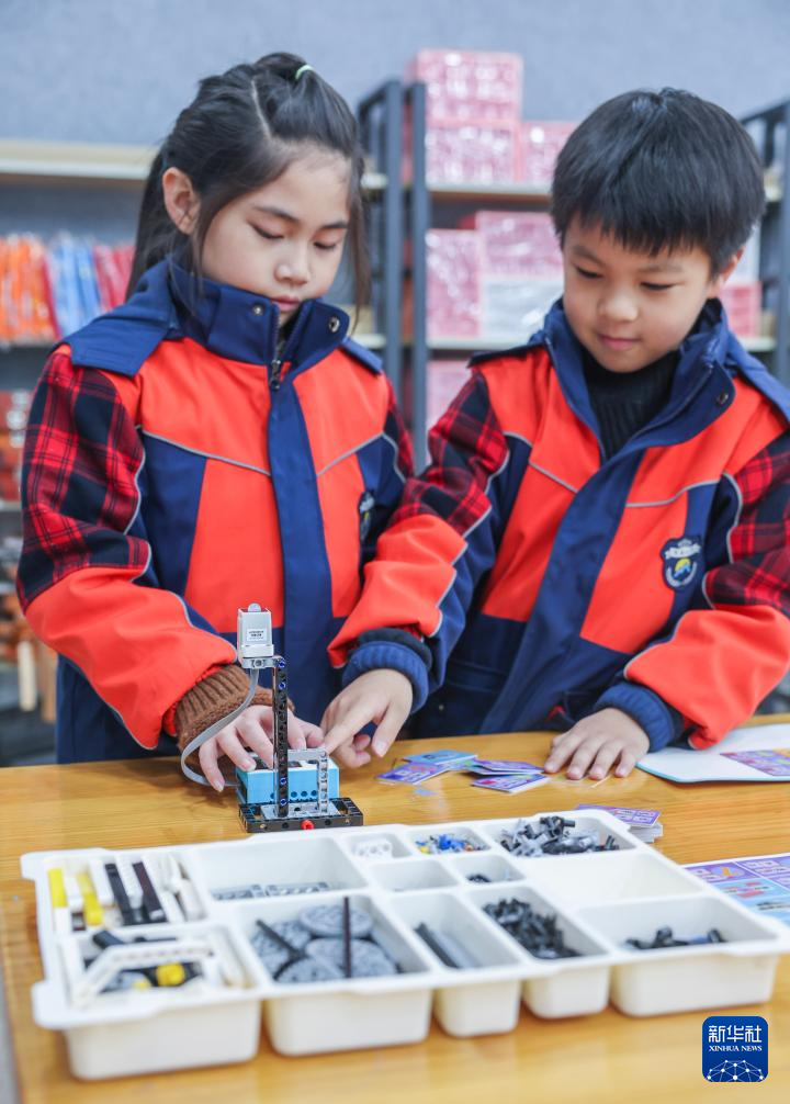 12月10日,诸暨市明德小学的学生在科学实验室上机器人搭建课程。