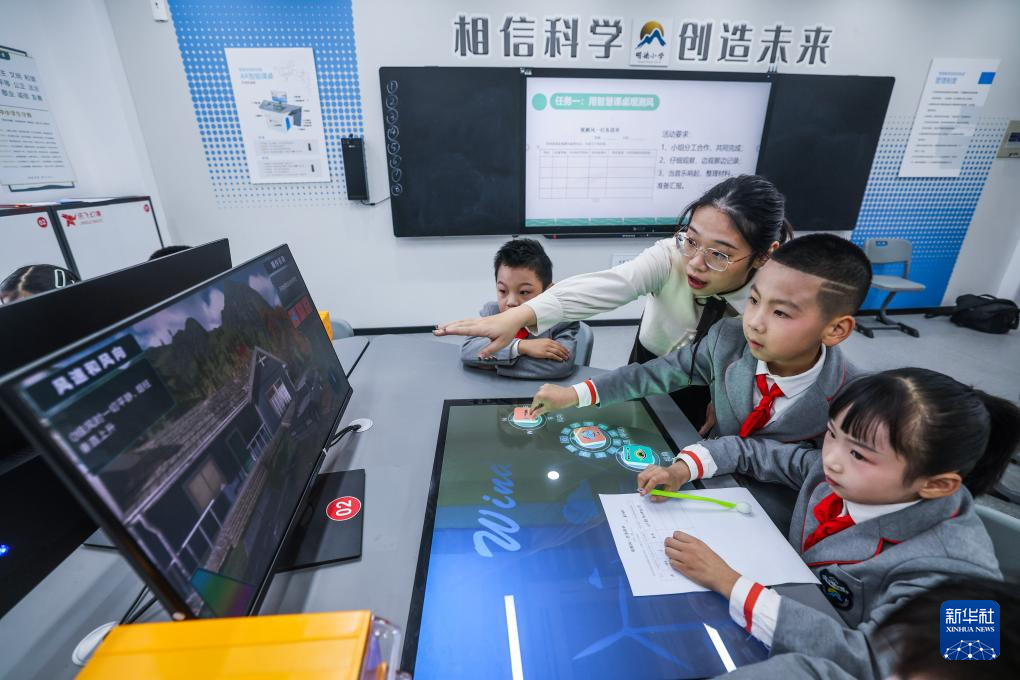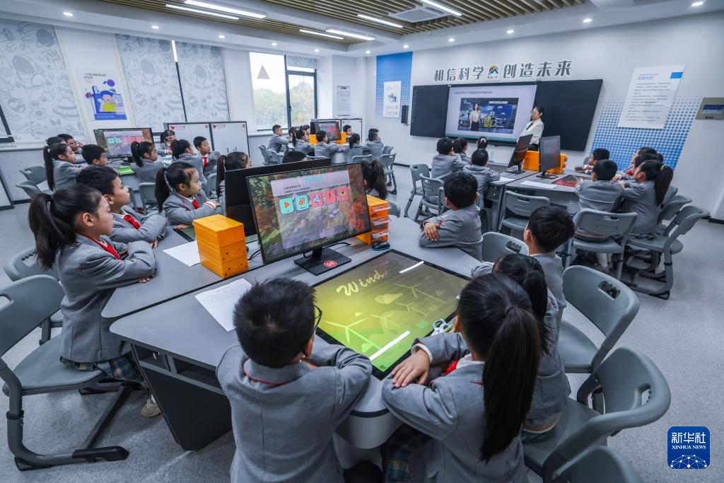 浙江诸暨市明德小学在落实国家智慧教育课程的同时,积极打造人工智能课程体系,加强学生科学素养。学校开设趣味编程、C++语言、机器人搭建、无人机创客等普惠式课程,同时引进了AR虚拟现实科普实验室,在动手操作中了解人工智能、感受科技魅力,给孩子们播下科学梦想的种子。