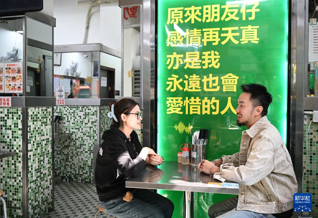 12月13日,邱志晖(右)在其创办的茶餐厅珠海夏湾店里和顾客聊天。
