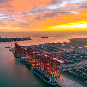 12月16日拍摄的河北省唐山港京唐港区繁忙的集装箱码头(无人机照片)。