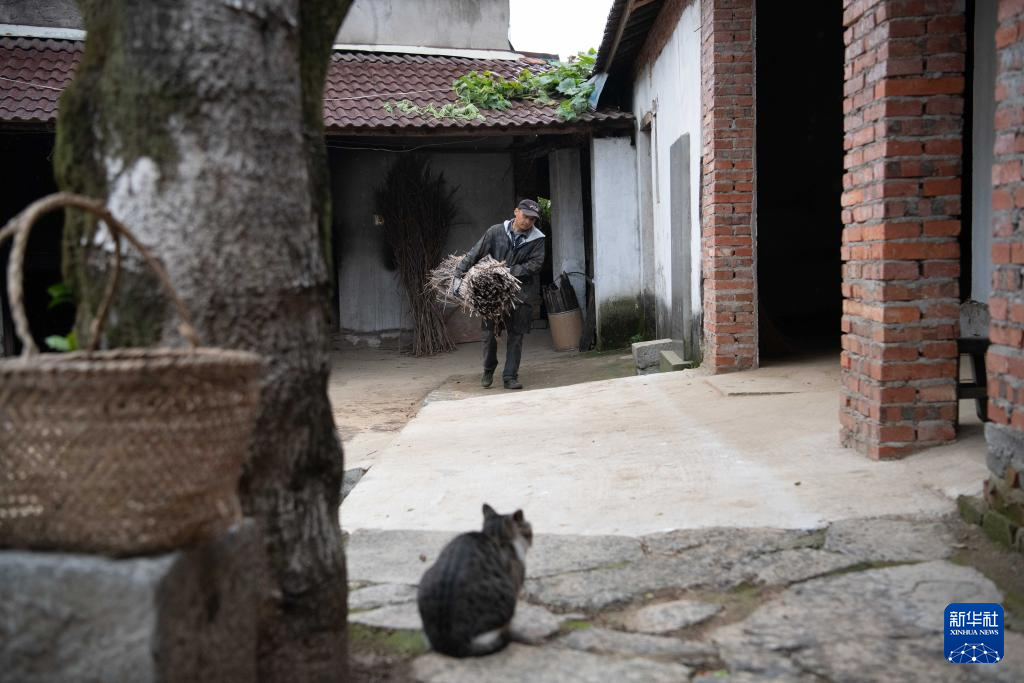 11月23日,在安徽省铜陵市义安区天门镇五峰村,“姜把式”盛义武的父亲盛昌春在姜阁下方帮忙生火,为存放其中的姜种增温保暖。