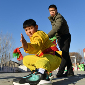 12月22日,在南皮县冯家口镇车官屯小学,沧州落子艺人在指导学生练习沧州落子。