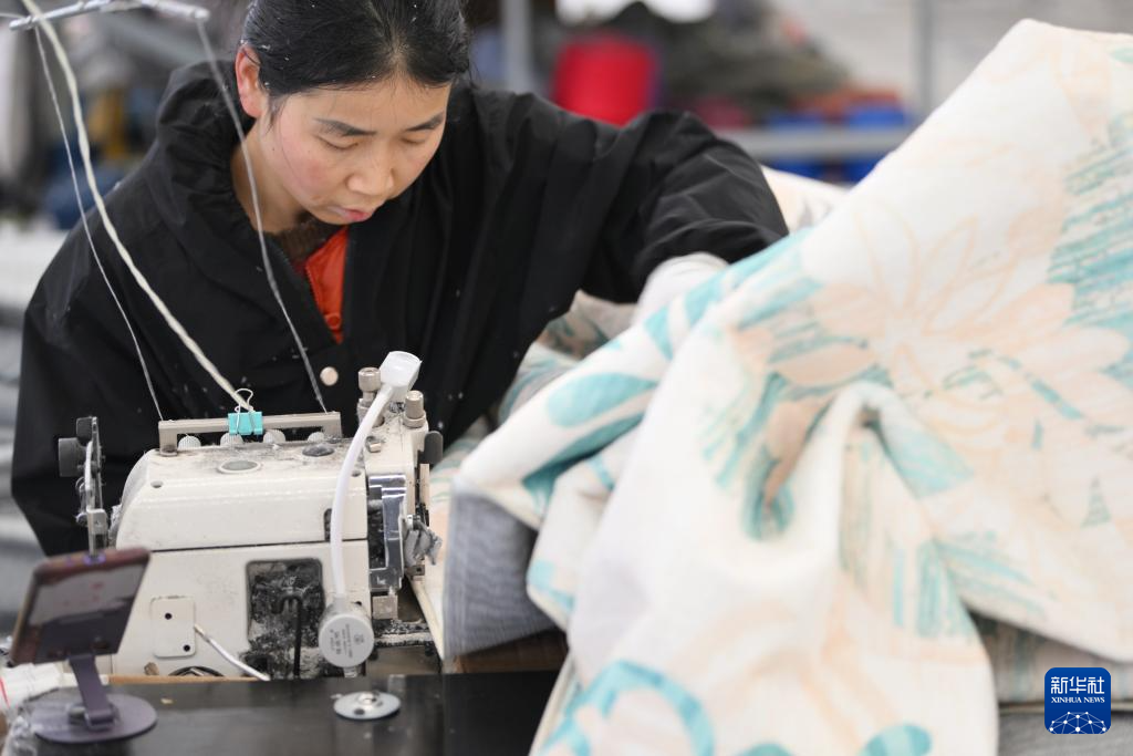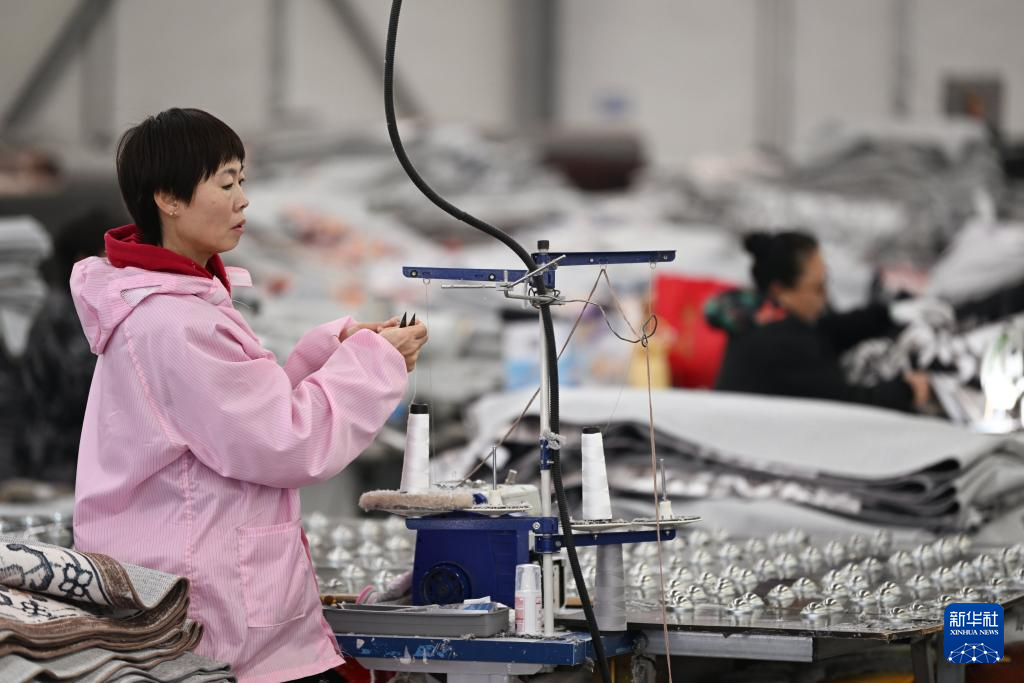 在崔黄口镇的安芝金林地毯有限公司,工人在缝纫机上放线(1月3日摄)。