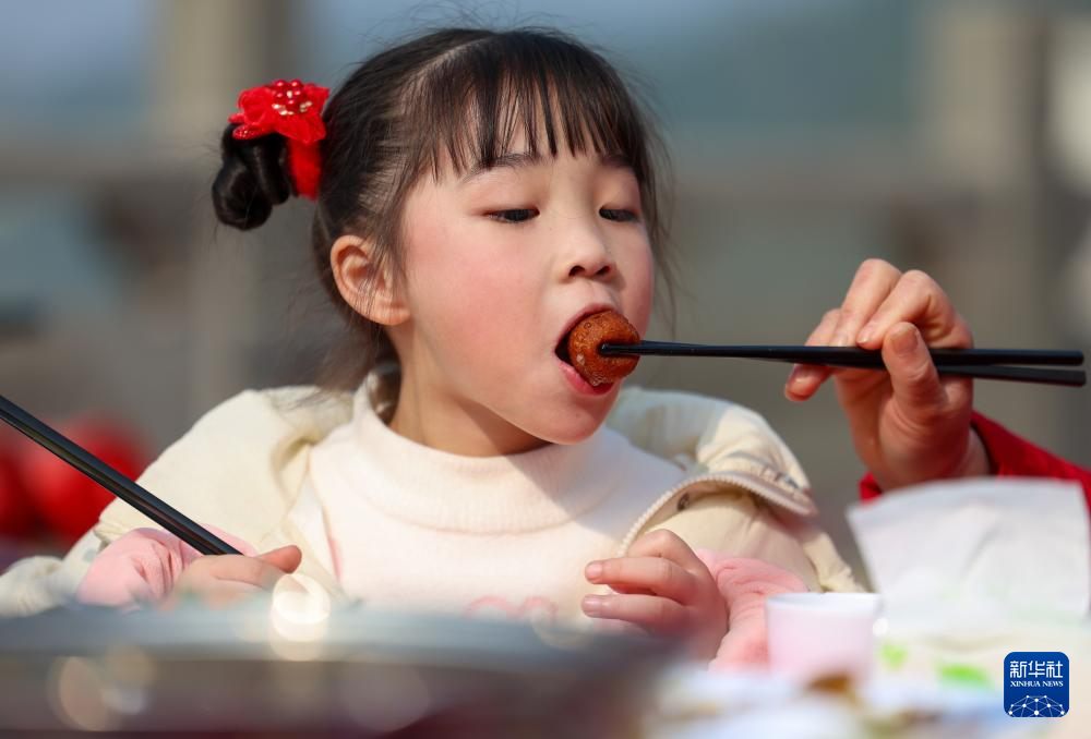 1月5日,在武胜县沿口古镇,一名参加庖汤宴的小朋友尝美食。