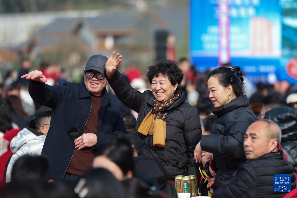 1月5日,在武胜县沿口古镇,参加庖汤宴的群众举杯相庆。