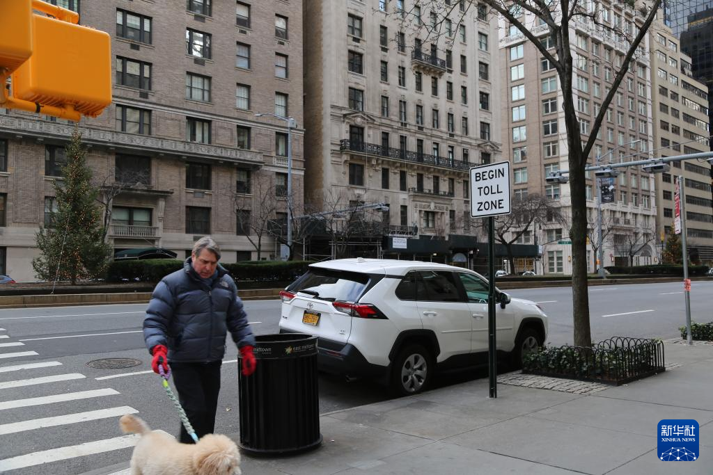 1月5日,在美国纽约曼哈顿,行人通过一个设有征收拥堵费标志牌的路口。