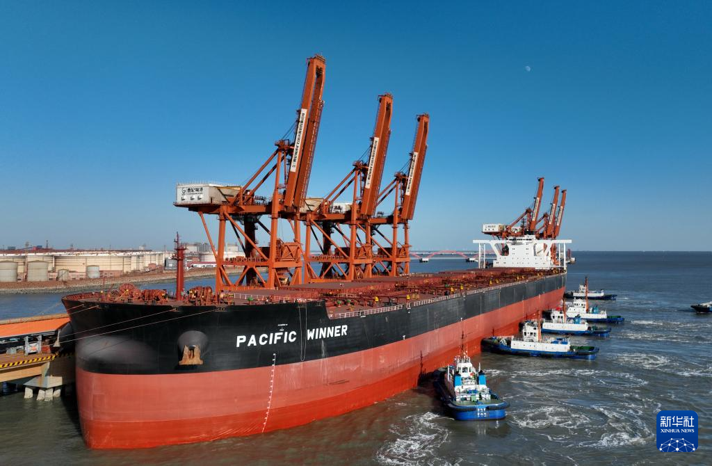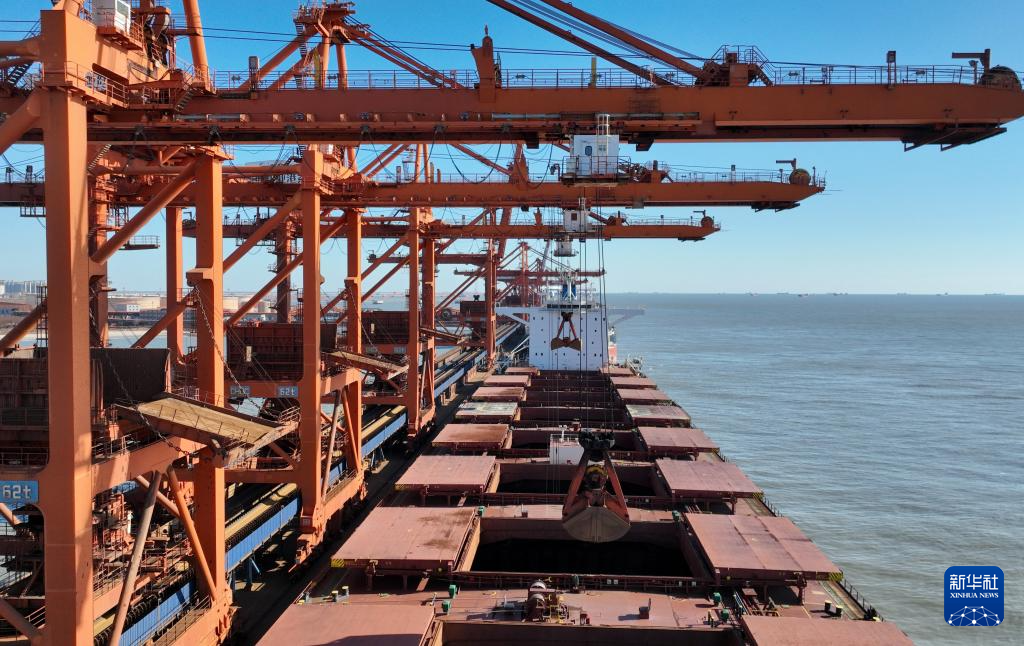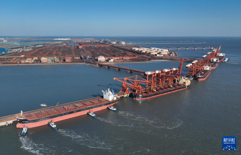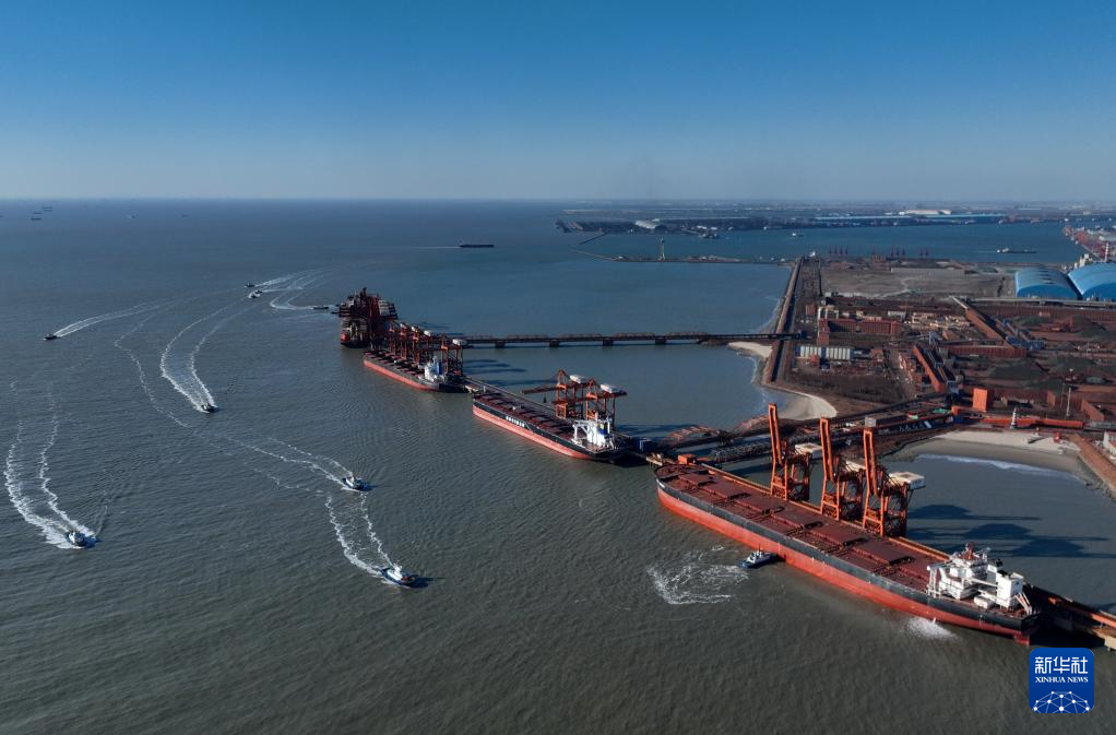1月9日,轮船靠泊在唐山港曹妃甸港区矿石码头卸载(无人机照片)。