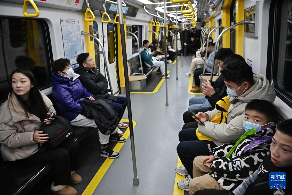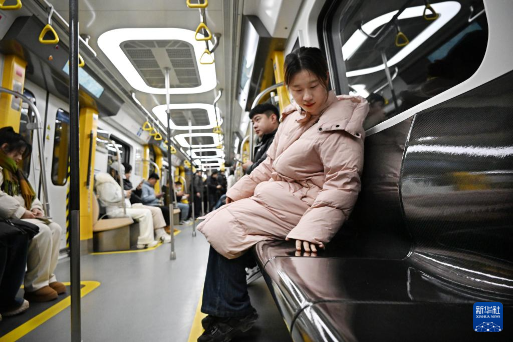 1月10日,乘客在青岛地铁1号线乘坐碳纤维地铁列车。