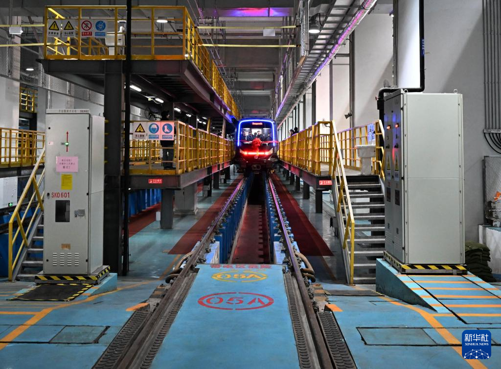 1月10日,碳纤维地铁列车即将驶出青岛地铁瓦屋庄停车场。
