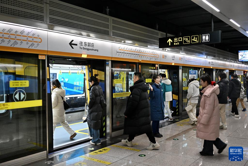 1月10日,乘客在青岛地铁1号线山里站排队进入碳纤维地铁列车。