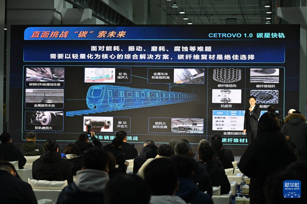 1月10日,中车四方股份公司技术人员在碳纤维地铁列车上线仪式上介绍“CETROVO 1.0碳星快轨”。