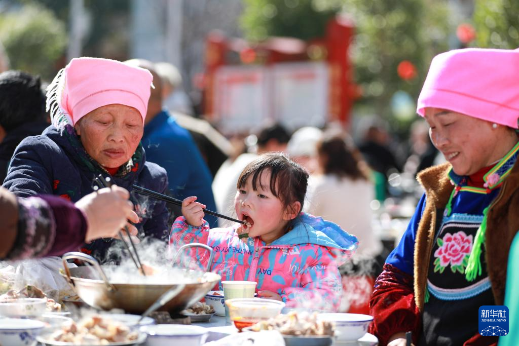 当日,贵州省黔南布依族苗族自治州都匀市小围寨街道思源社区群众欢聚一堂,一起跳竹竿舞、芦笙舞,观看舞龙、舞狮表演,参与打糍粑、趣味游戏等活动,一起吃团圆宴,共迎幸福年。