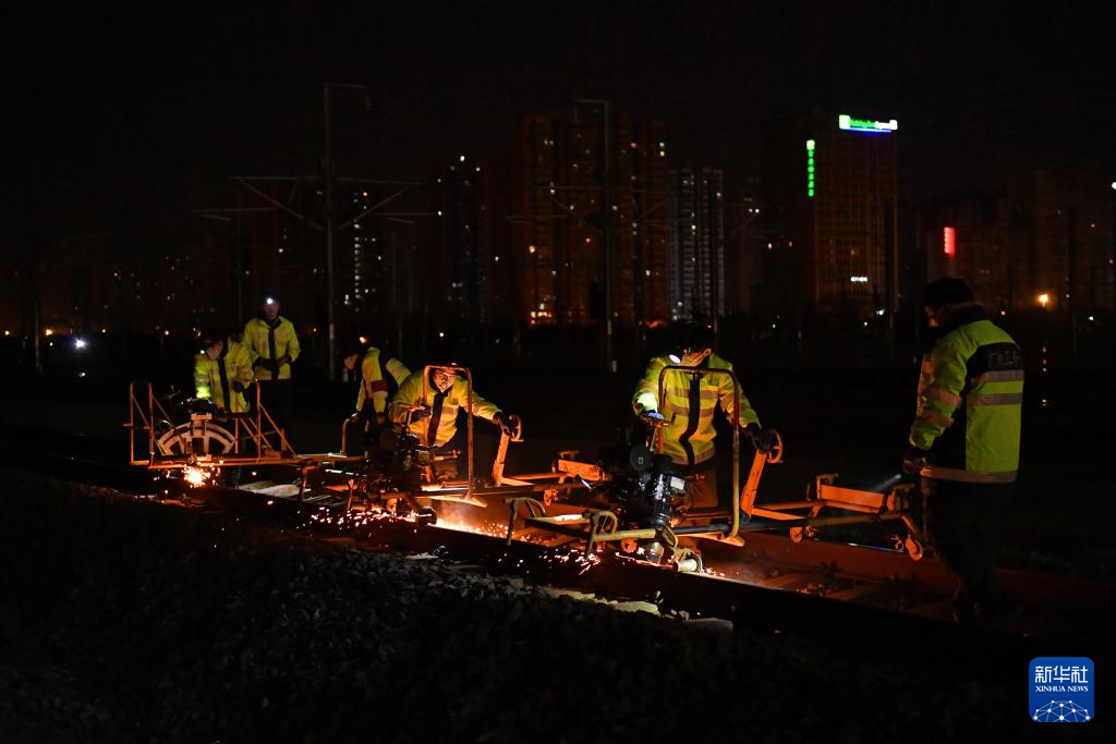 1月16日凌晨,长沙高铁工务段线路工在长沙南站沪昆场打磨钢轨。