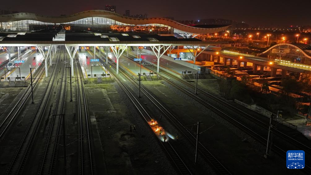 1月16日凌晨,长沙高铁工务段线路工在长沙南站沪昆场打磨钢轨(无人机照片)。