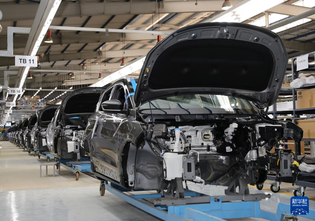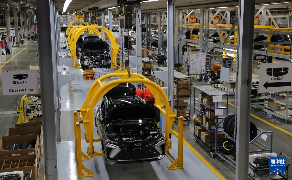 这是1月15日在埃及吉萨省十月六日城拍摄的吉利汽车埃及工厂生产线。